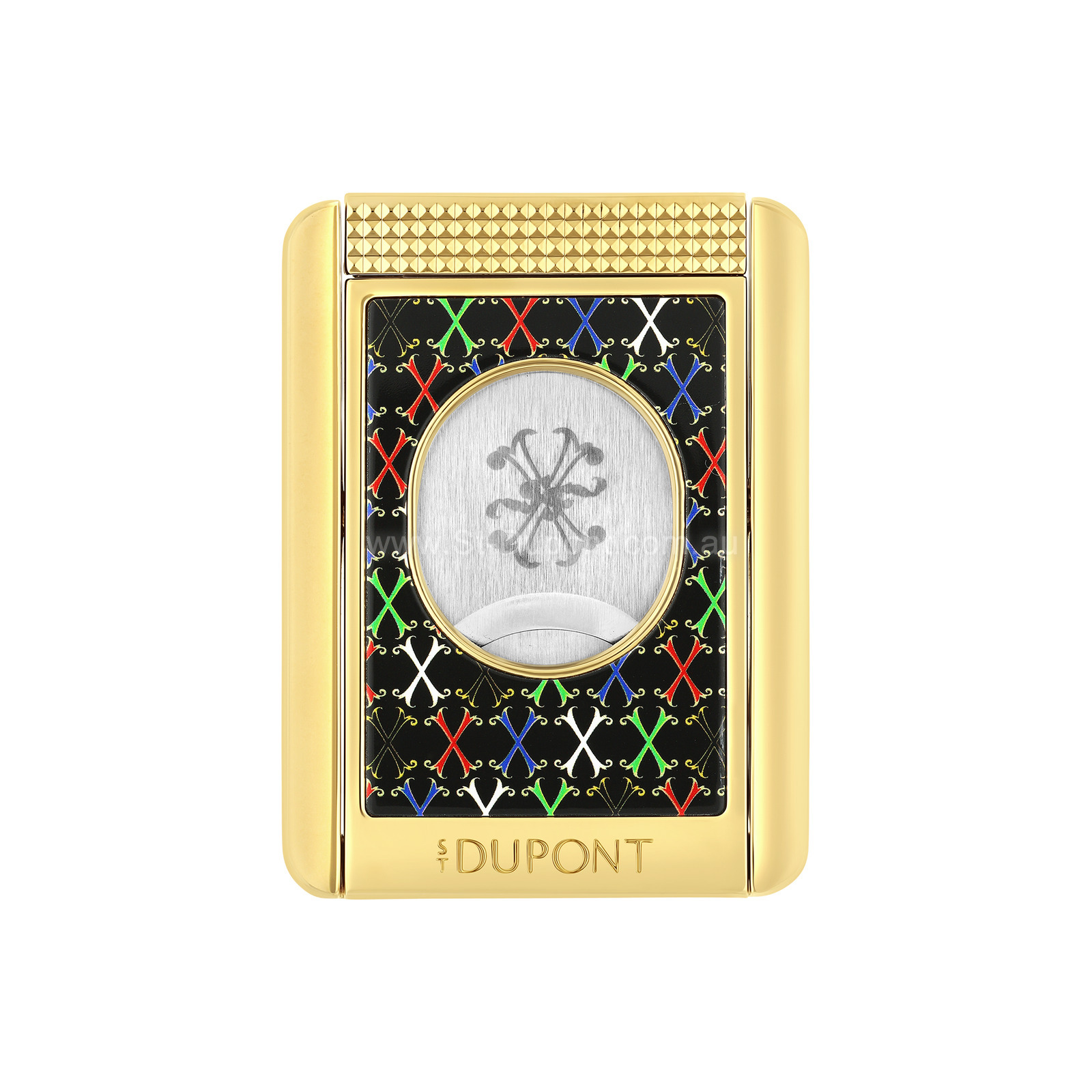 Cigar Cutter Stand - Black glossy lacquer decorated with the multicolor X monogram and Opus X Fuente crest engraved on the front blade; iconic D engraving on the rear blade. Diamond-point guilloché. Gold finishes