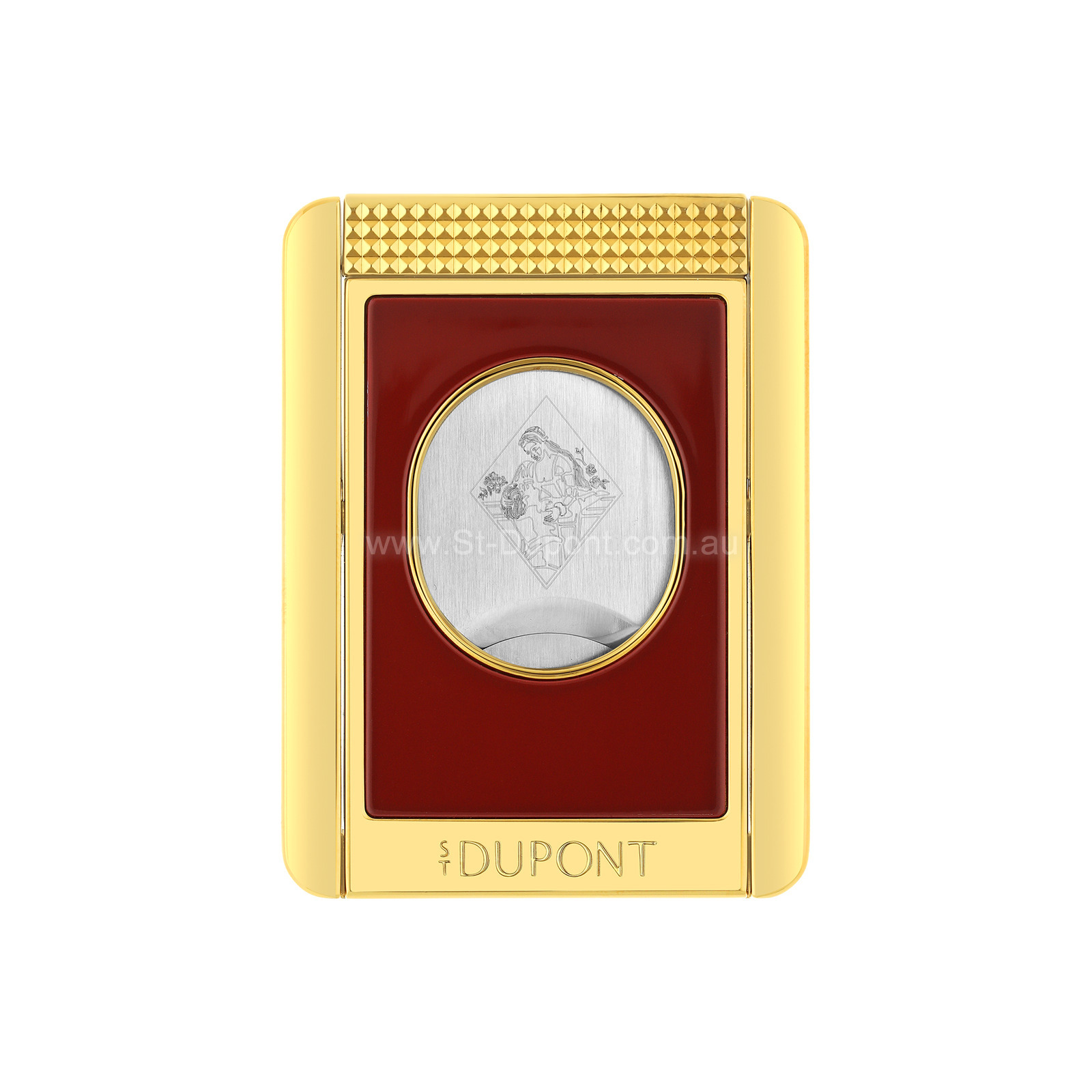 Cigar cutters stand decorated with a shiny red lacquer on the front and the coat of arms engraved on the blade. Glossy white lacquer on the back with the iconic engraving D. Golden finishes.