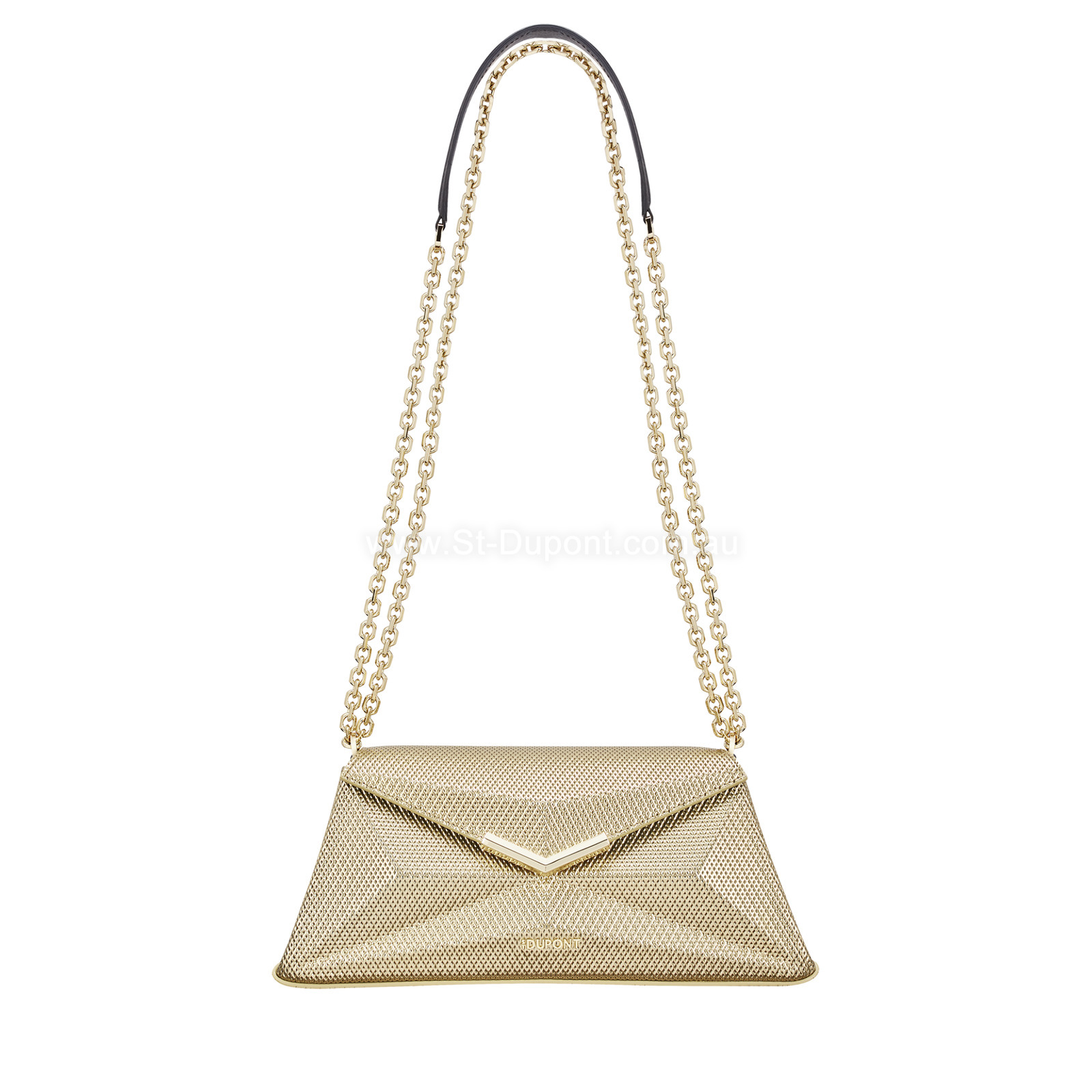 With the X-Bag Baguette, the iconic guilloché pattern found on S.T. Dupont lighters and pens is reinvented in an elongated and elegant form. A large “X” pays homage to a refined and sophisticated lifestyle. This model pays homage to the House's signature style, inspired by the Firehead guilloché pattern, one of the most iconic motifs in S.T. Dupont's goldsmith creations. This guilloché leather bag, inspired by the House's expertise, is embellished with elegant palladium finishes and a metal chain. The gold mesh X-Bag Baguette creates a distinctive and vibrant silhouette. It is easy to carry and will go perfectly with your most beautiful evening outfits. The leather used for the X-Bag Baguette is LWG certified, guaranteeing environmentally friendly production.
