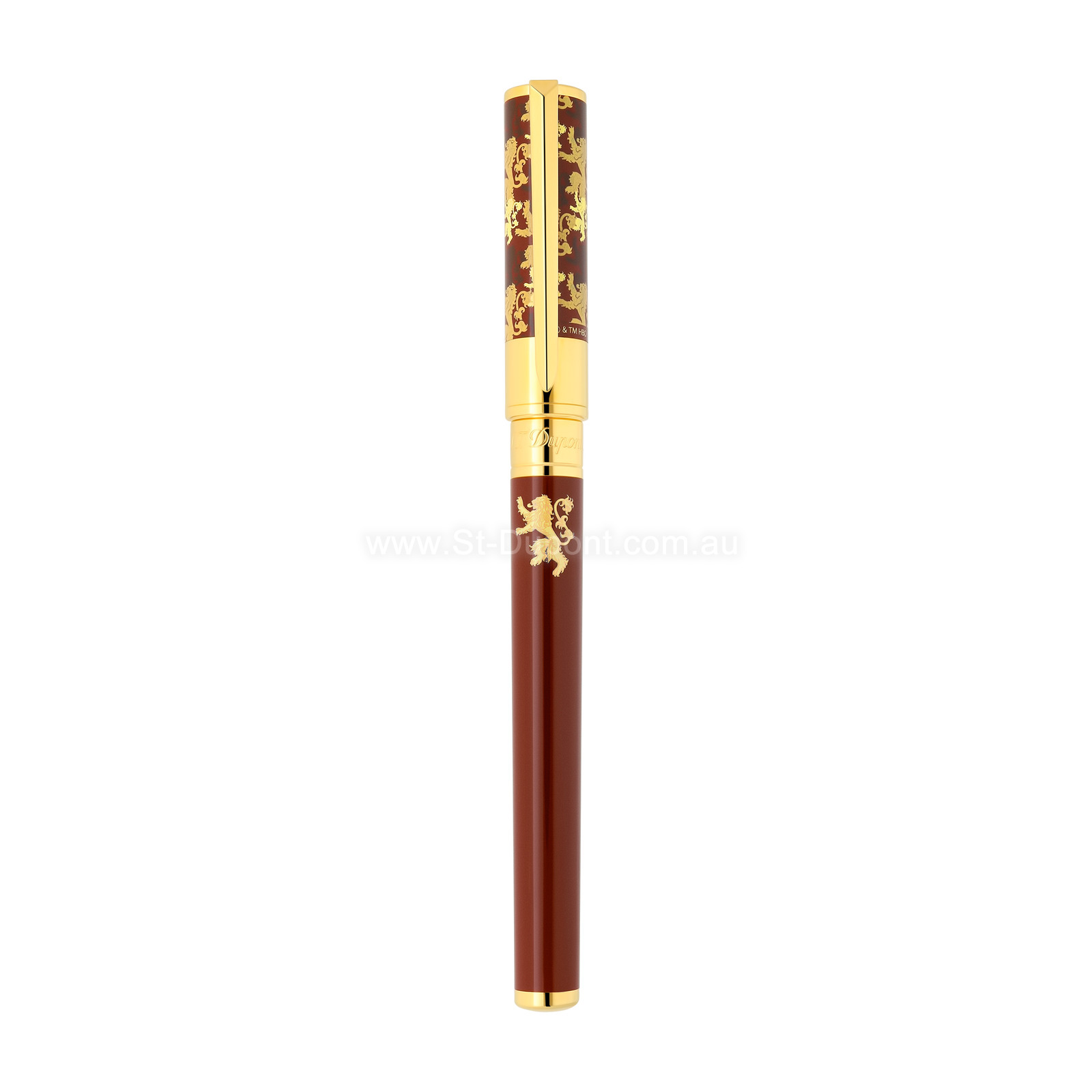 Initial rollerball pen with glossy burgundy lacquer and gold finishes. Cap decorated with the Lannister House emblem, the lion, and its motto "Hear Me Roar." Associated refills: 040840 Blue - 040841 Black.