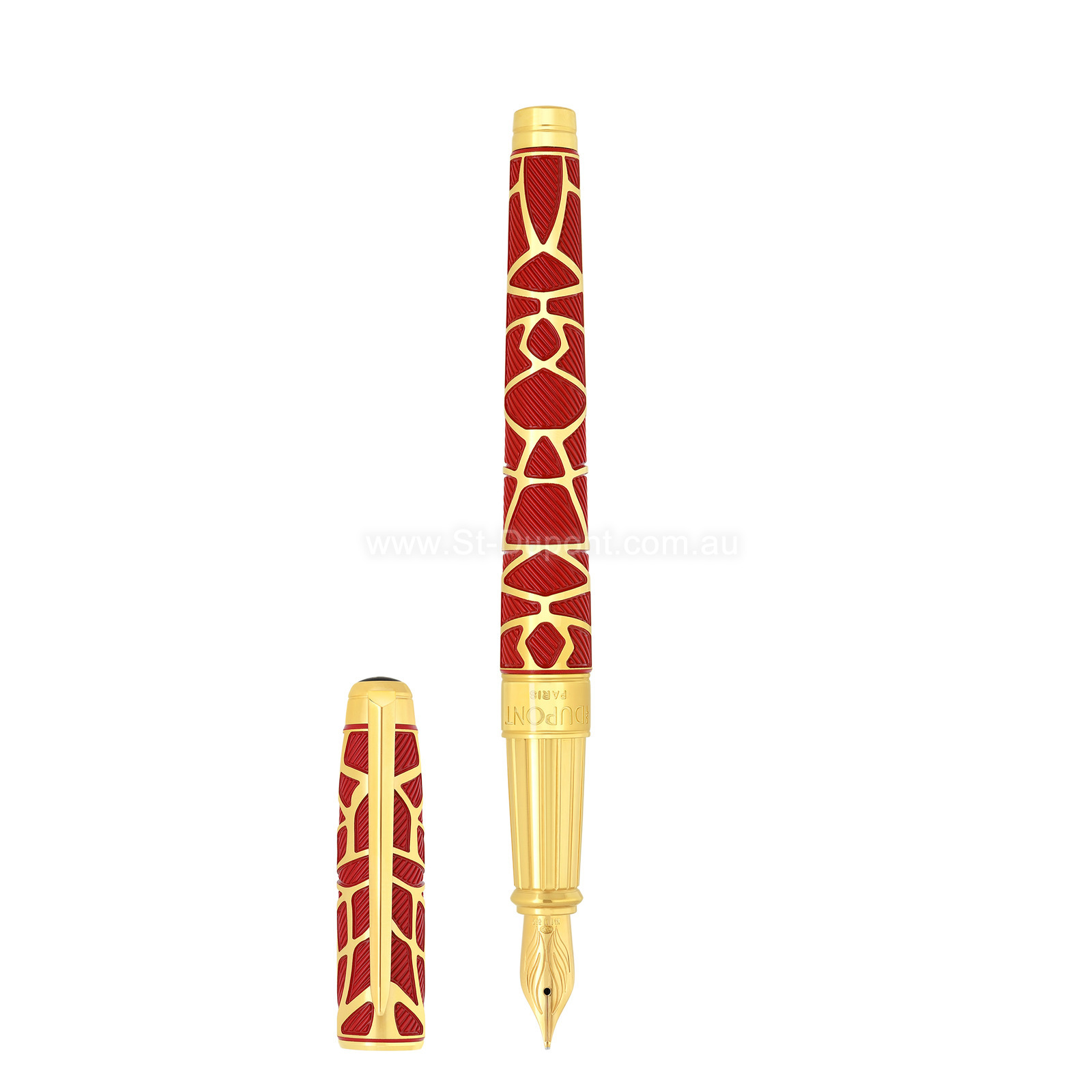 S.T. Dupont partners with French artist Richard Orlinski for an exclusive collection where the power of sculptural gestures meets the precision of artisanal craftsmanship. Inspired by the iconic “Kong” motif and the wildness of nature, this collaboration brings a raw, contemporary energy to the Maison’s creations. Lighters and writing instruments become true works of art, enhanced by angular lines, contrasting textures, and vibrant colors. The “Red” line showcases exceptional technical craftsmanship, combining a new brushed gold finish with a “Kong” motif created in metal filigree and a 1970s-inspired guilloché pattern that produces a sense of movement in the material. These refined techniques are applied to the Ligne 2 lighter and Line D Eternity pen in red and gold, delivering a signature that is both precise and sculptural. Line D Eternity Large fountain pen with diagonal red lacquer guilloché, adorned with the brushed gold “Kong” motif. Gold finishes. Articulated Sword clip. Wings nib in 14K solid gold. Piston included. Made in our workshops in Faverges, France. Also available in roller and fountain pen versions. This fountain pen comes with a medium nib, providing an approximate writing size of 0.55 mm. Associated refills: Ink cartridges: 040112 Blue – 040110 Black – 040362 Red – 040363 Green – 040364 Turquoise Inkwells: 040165 Black – 040166 Royal Blue – 040167 Vibrant Red – 040168 Spring Green – 040169 Turquoise – 040170 Midnight Blue